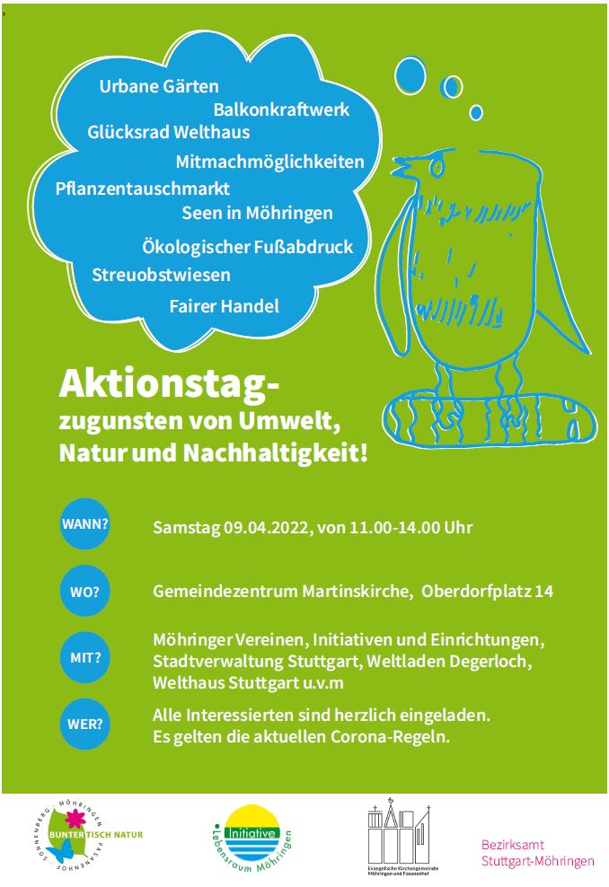 Herzliche Einladung zu unserem Aktionstag zugunsten von Umwelt, Natur und Nachhaltigkeit am 09.04.22 im ev. Gemeindezentrum der Martinskirche in Möhringen. Hier finden Sie alle Infos: