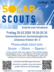 Wer den Infoabend verpasst hat, kann die regelmäßigen Sprechstunden der SolarScouts in den Möhringer Teilbezirken besuchen (Termine auf https://natur-moehringen.de/solarscouts ) oder sich direkt per E-Mail an info@solarscouts-moehringen.de wenden.