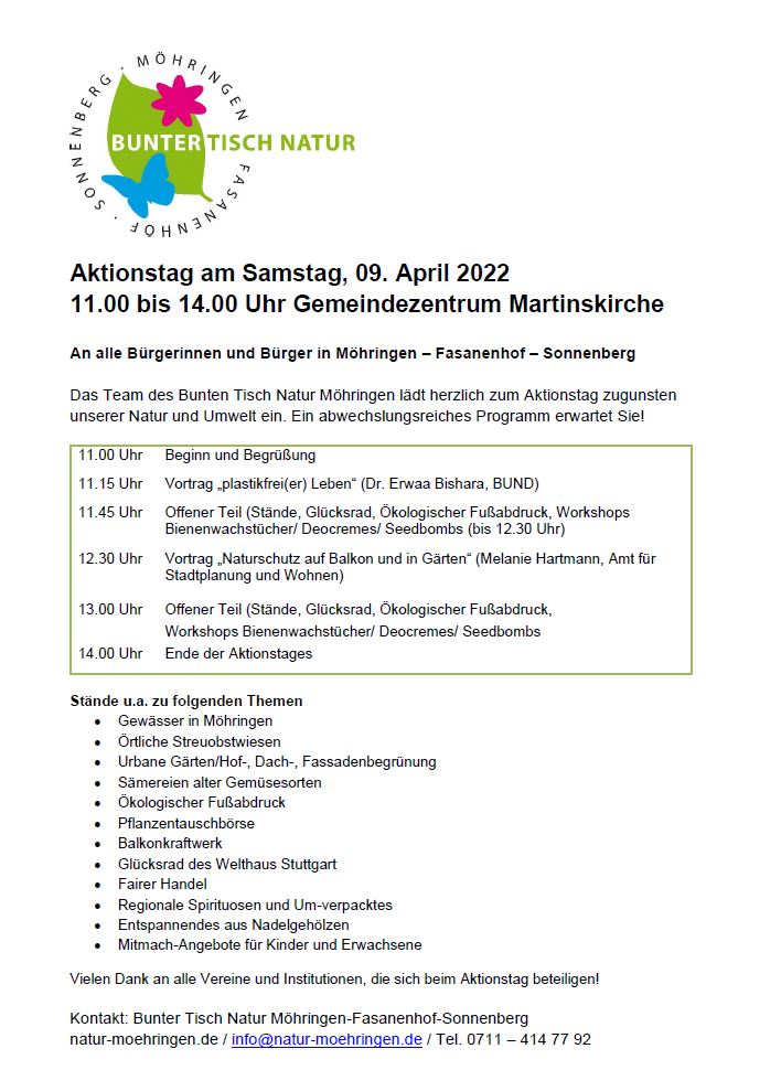 Herzliche Einladung zu unserem Aktionstag zugunsten von Umwelt, Natur und Nachhaltigkeit am 09.04.22 im ev. Gemeindezentrum der Martinskirche in Möhringen. Hier finden Sie alle Infos: