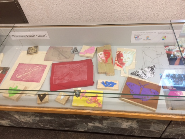 In der Stadtteilbibliothek Möhringen sind die Vitrinen im Eingangsbereich vom La Fuchsia Kollektiva mit Ergebnissen aus der inklusiven „Druckwerkstatt Natur“ sehr schön gestaltet worden. Die Druckwerkstatt Natur wurde am 18. und 19.08.21 als ein Angebot des bhz Stuttgart e.V. und des Kinder- und Jugendhaus Fasanenhof durchgeführt. Die Druckwerkstatt war Teil des Bunten Tisch Natur inklusiv. Vielen Dank an alle Beteiligten! Ich hoffe, dass eine solche Druckwerkstatt wieder einmal stattfindet.